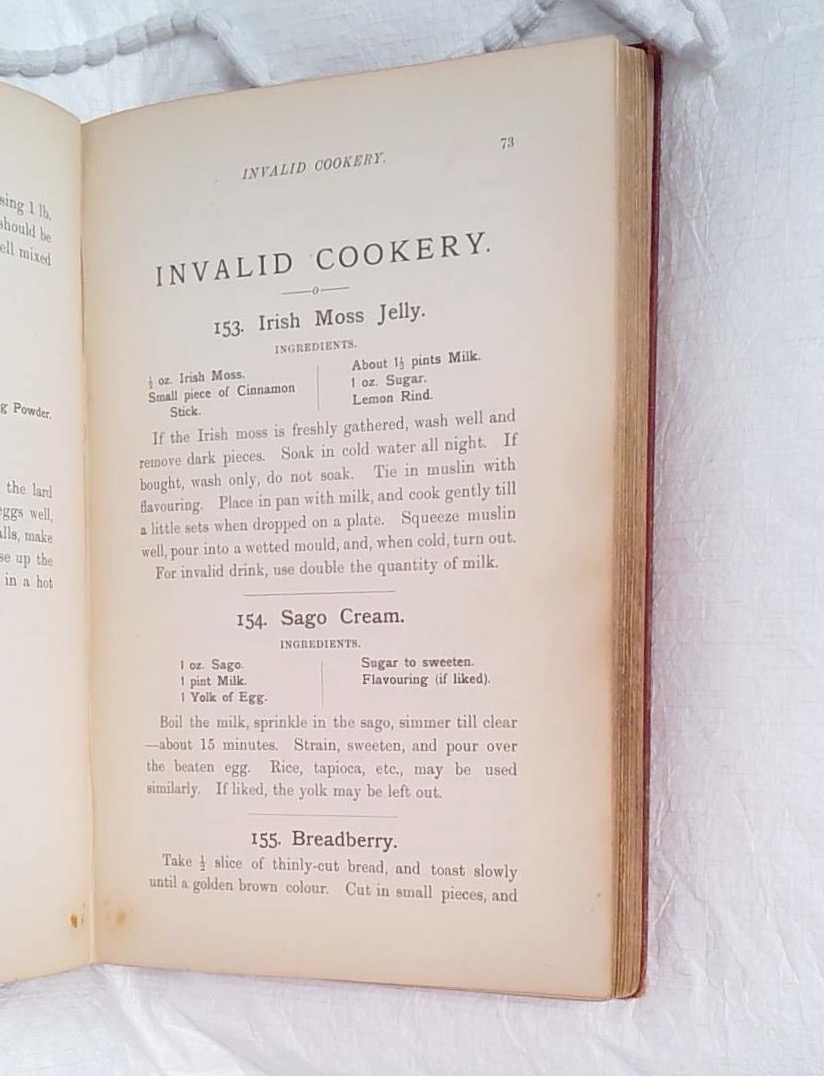 These recipes were for both foods and beverages for the ill, and many of them are like recipes found earlier cookbooks like Margaret Black’s Household Cookery and Laundry Work and Superior Cookery (1882). As noted in the section on published cookery books, Black was the principal of the West End School of Cookery, having left the Glasgow School of Cookery to form her own establishment. She passed away in 1903, when her niece Mary MacKirdy took over, before the West End School became amalgamated with the Glasgow School of Cookery to form the GWSCDS in 1908. At this point, MacKirdy stayed on in the role of head of the cookery department. Given that Black was employed at the Glasgow School of Cookery (she was the first cookery teacher there having been sent to South Kensington Cookery School for training) her legacy as a culinary educator who published cookbooks from Glasgow means that her publications and teachings were very likely to have a large influence on the GCB. Her integral role in both the Glasgow Cookery School and the West End School of Cookery mean that her teachings were at the root of culinary education in Glasgow, and so connections between her earlier cookbooks and the GCB are unsurprising.